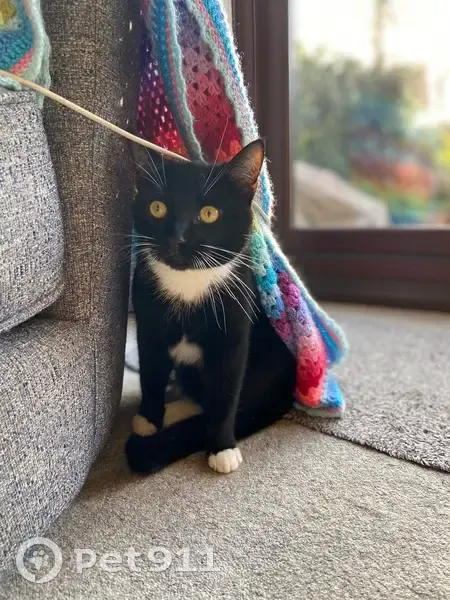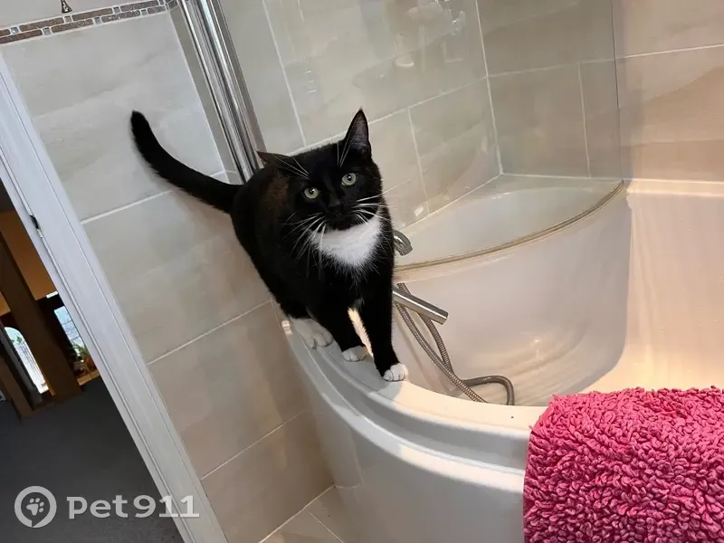 Black cat with white bib and white paws and legs. One spot of white under his bum. He is very timid and he doesn’t make any noise unless scared. He may come when called - Moz / Mozzie