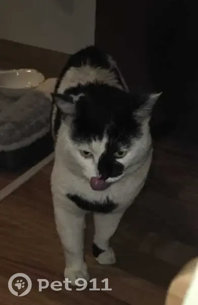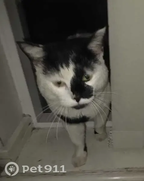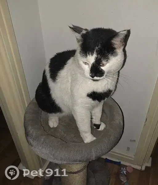 Black and white male cat with distinctive facial markings (black patch over left eye and nose). Mild-mannered and friendly. No collar. Not neutered. Followed our cat home and has been staying with us—we’ve started feeding him.