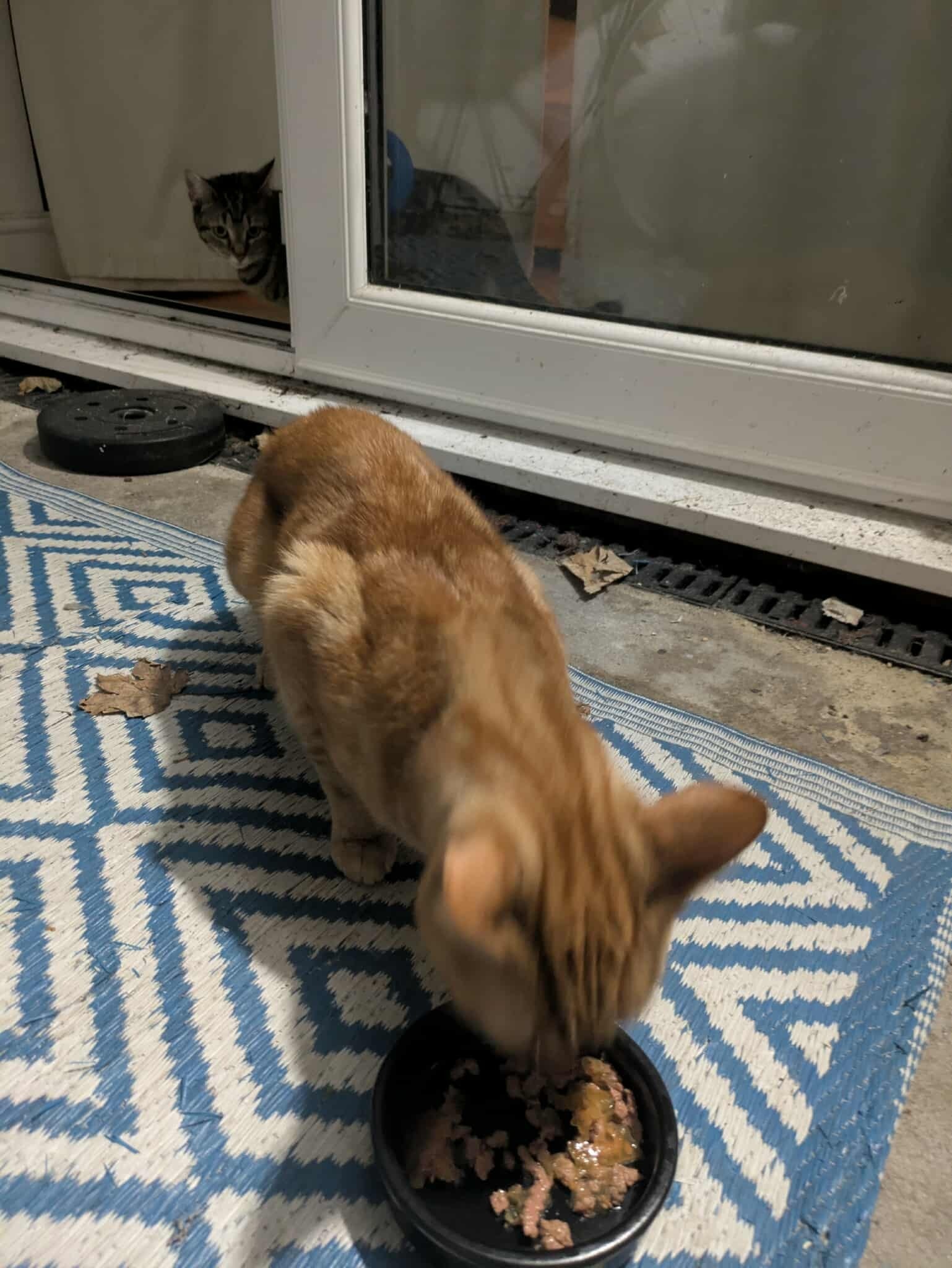 - This ginger cat has turned up at our flat. He/she looks like she might have recently had some kind of surgery. - She seems quite malnourished, absolutely ravenous.