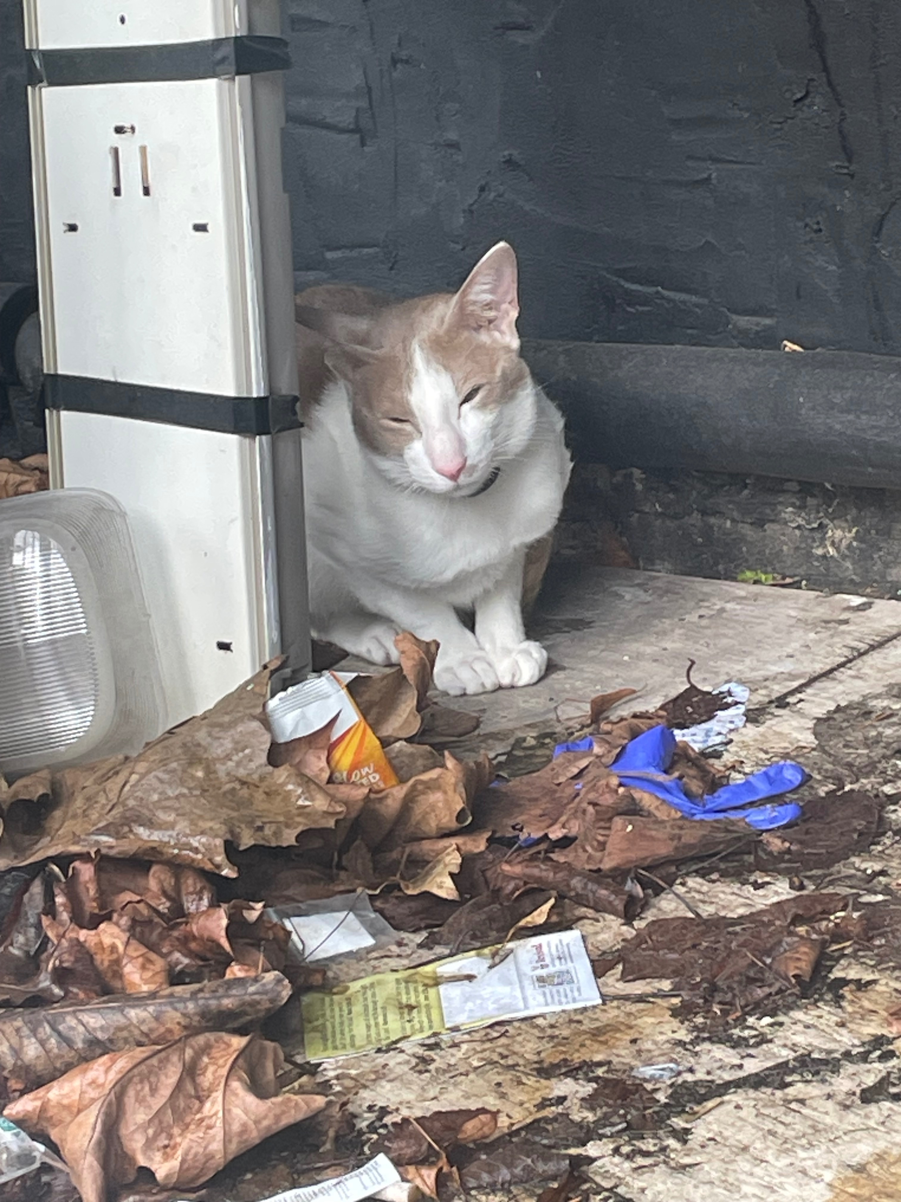 White and brown cat with piercing green eyes. With black collar that appears to have a tag on it Is very frightened so I can’t get too close close to it as done rant it to run. Has taken shelter off the road so is safe for now and I have fed it