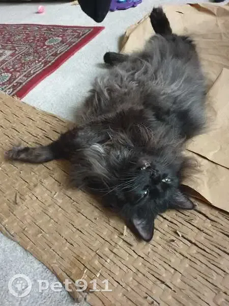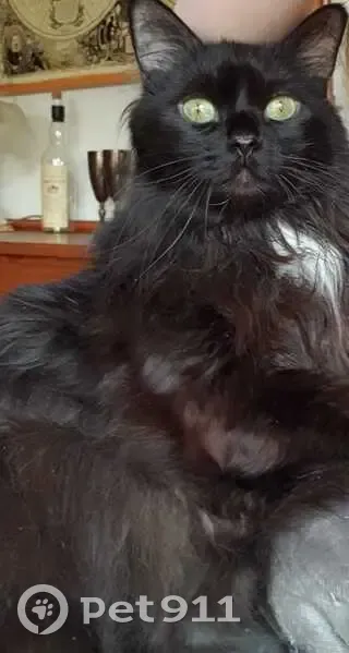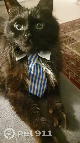 Long black greying fur with little white on the chest, front legs shaved from the vet and missing patches of fur on back legs/tail. Tail is very sparse with hair right now. Hes larger (fatter) than the average cat, incredibly skittish and cannot be approached. Hes currently on daily medication for diabetes and antibiotics for a tooth infection after an extraction. He also has a wound on his back near his tail from pulling out his hair from stress (due to medication)