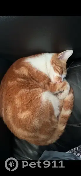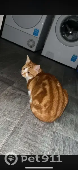 A ginger coat with white belly and paws.Ginger tail with a white dot at the end,orange eyes,short haired.He is very scared of loud noises and strangers and most likely to run away.Please check sheds ,garages and gardens because he likes those places a lot and might be hiding.He was last seen in pear tree area on tuesday evening.