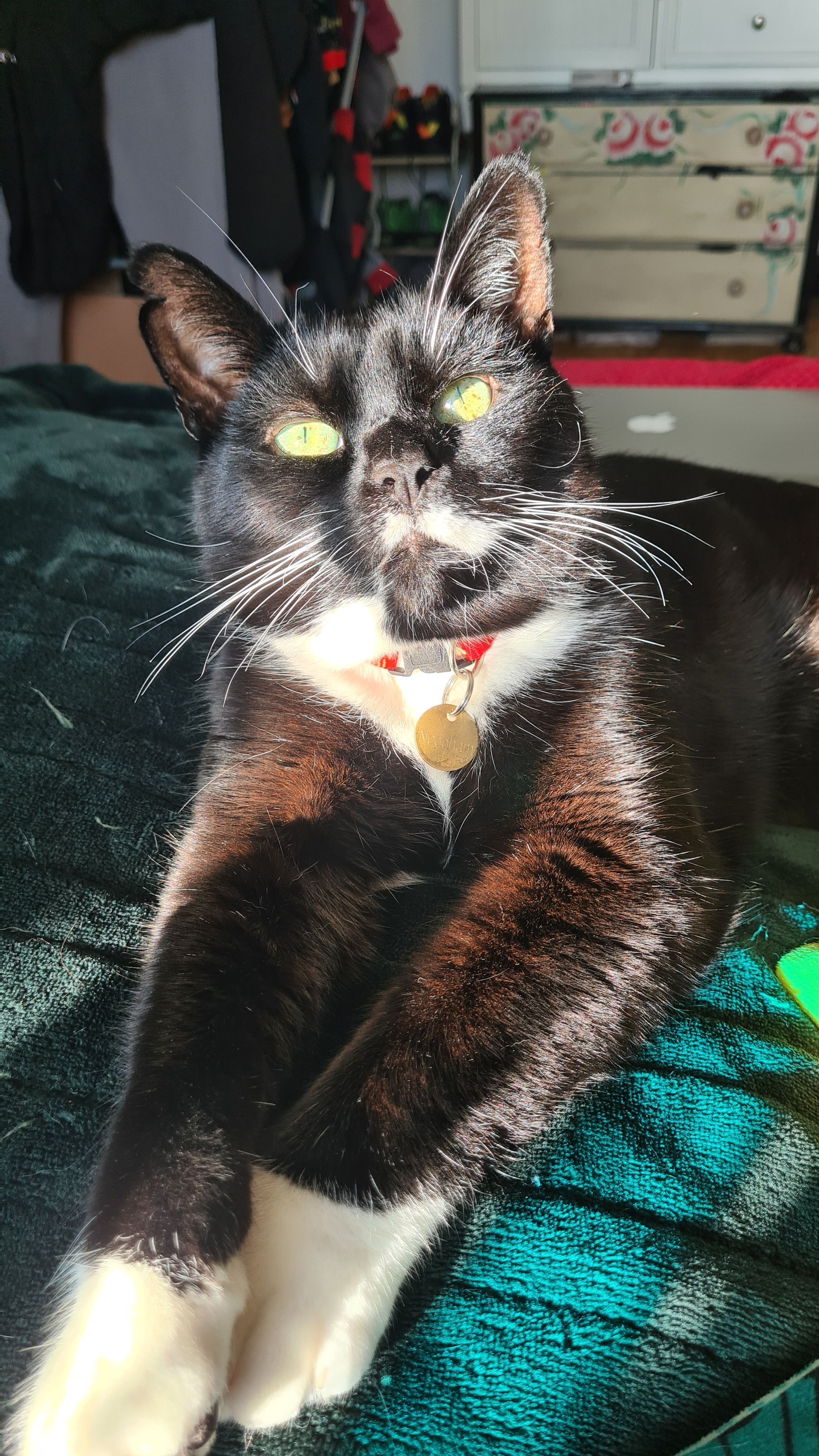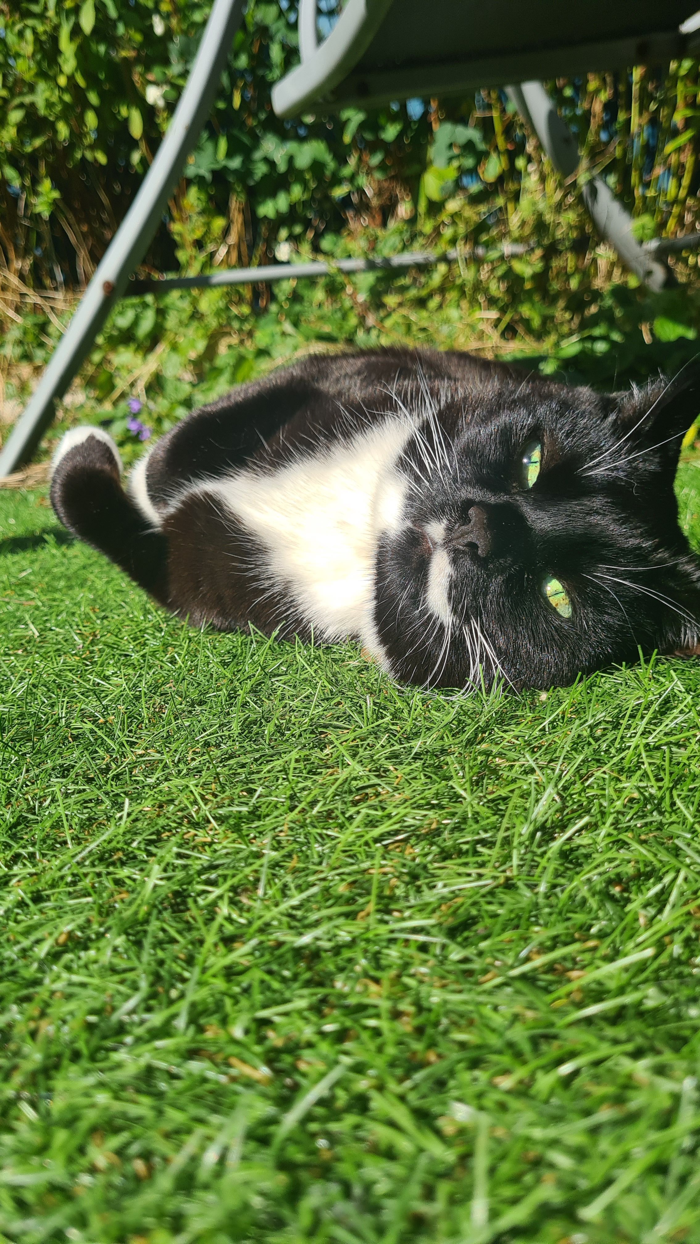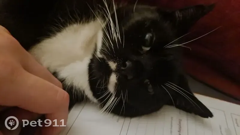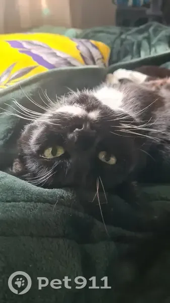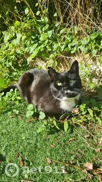 Very shy and skittish. He's quite large, mostly black with white mustache, white socks belly and neck, rips in ears and should have a red collar with my number on it. He was let out around 1am in the garden and never came back. I reckon he's run off into the estate where he's not been before and lost his bearings. He will be hiding somewhere so check your gardens and sheds.