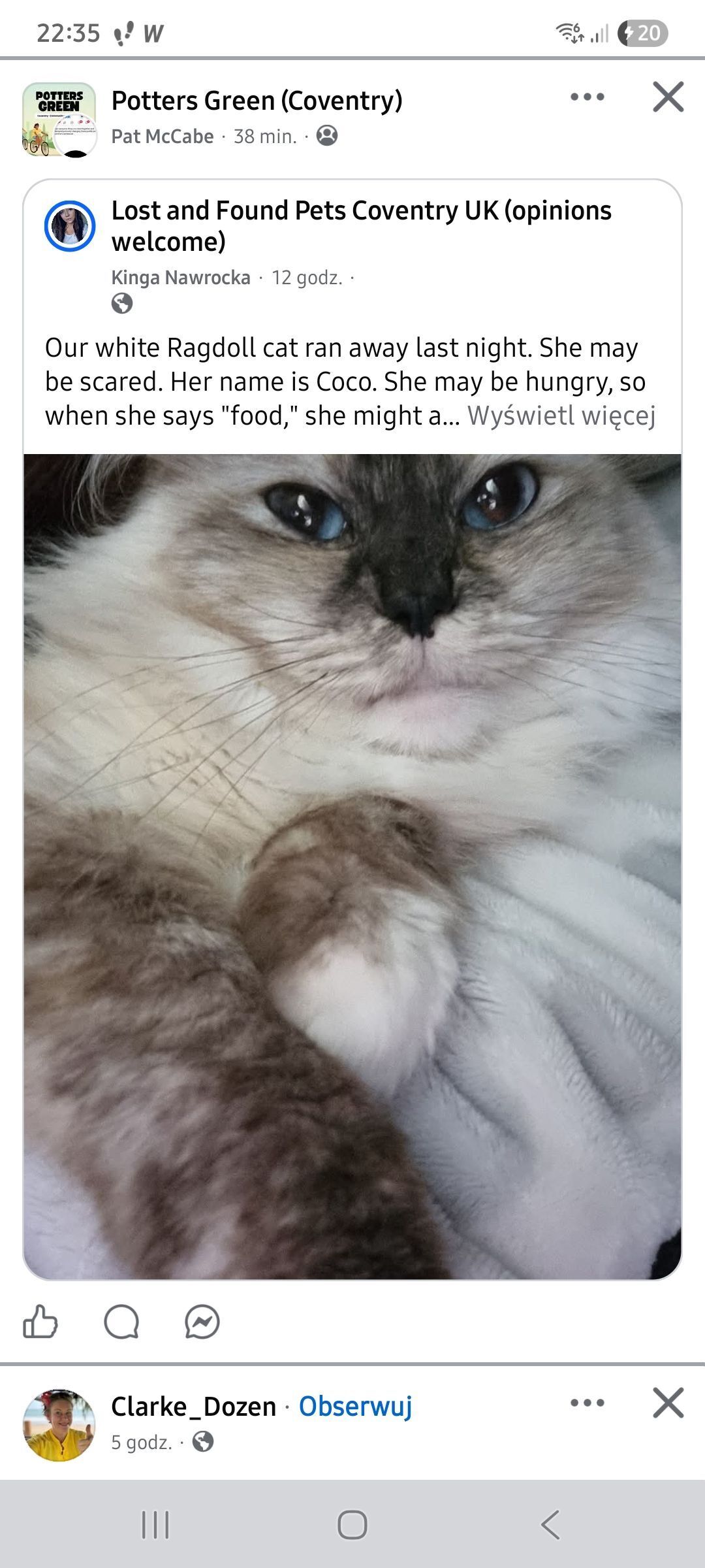 Please share! She went missing a few days ago on CV2 Potters Green, Henley Green. Her name is Coco. She's white but has dark paws. One front paw is completely white. She has a distinctive nose. I suspect she was stolen because all the ads I put up in my area keep disappearing. There's a cash reward. Please help me find my cat. No collar