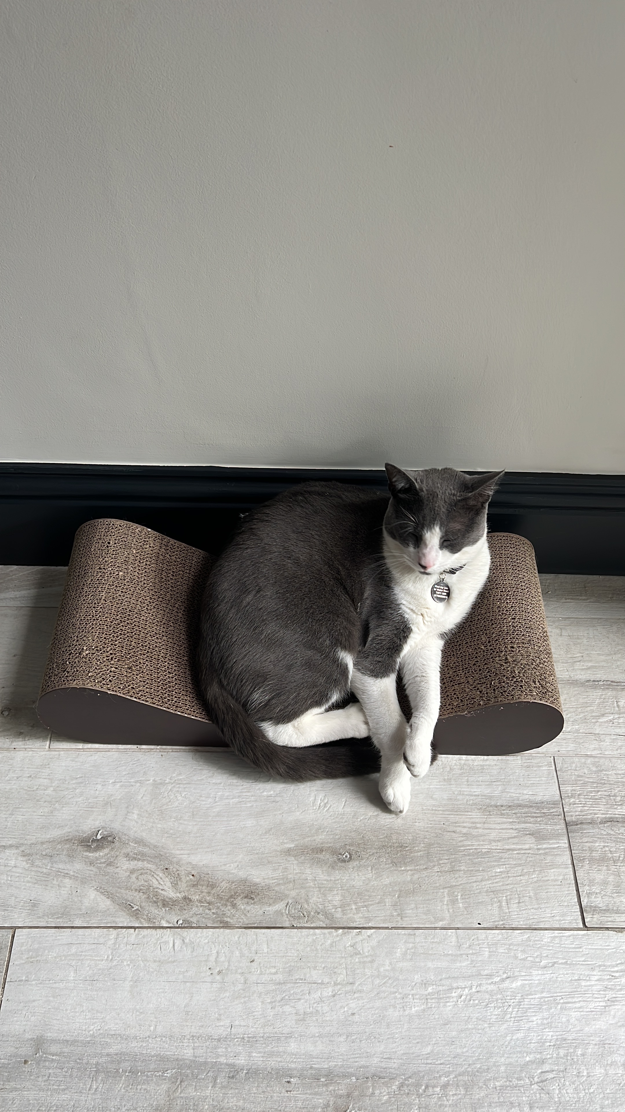 Bob is a male grey and white short haired domestic cat. He was wearing his blue leather collar with silver tag when he went missing. He is chipped and neutered.