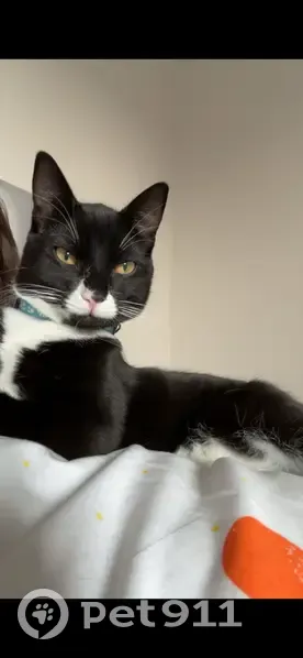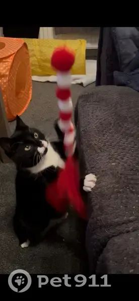 Tuxedo white paws and a white nose. Half his nose is pink and half black. He’ll be very scared
