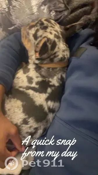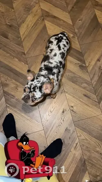 • Is a French Bulldog • Has one blue eye and one dark eye • Has a merle spotted coat