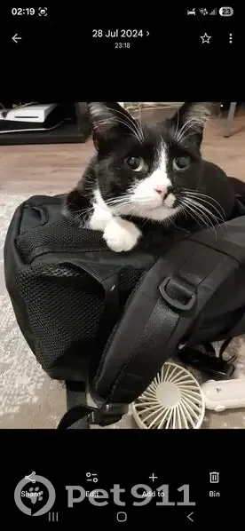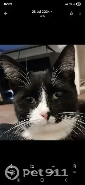 She is a black and white cat(just like a tuxedo suite) and she is thin and wears a pink collar paw printed with piece of metal(where the bell used to be).. She is also an anxious cat.