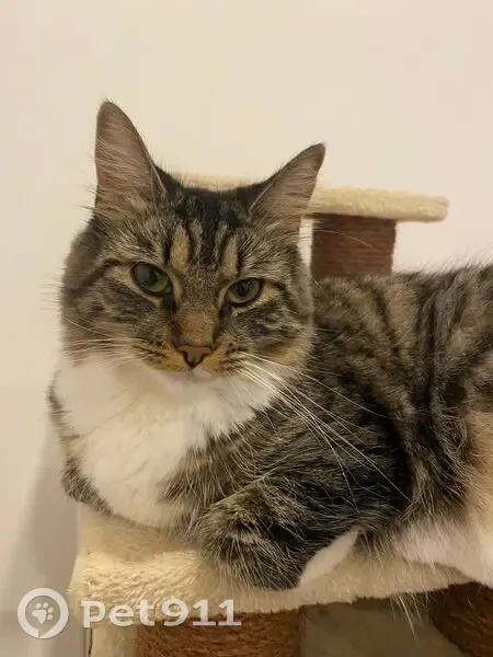 My cat is a female called Luna, a medium‑to‑large, long‑haired domestic cat with a very fluffy appearance. The fur has brown, black, and grey tabby markings, with a white chest, white belly, and white paws. The tail is very long and thick, with dark tabby colouring. The face has clear tabby markings, bright eyes, and tall upright ears. She has a soft, plush-looking coat and a distinctive contrast between the darker fur on her back and the white fur on her underside. Photo attached.