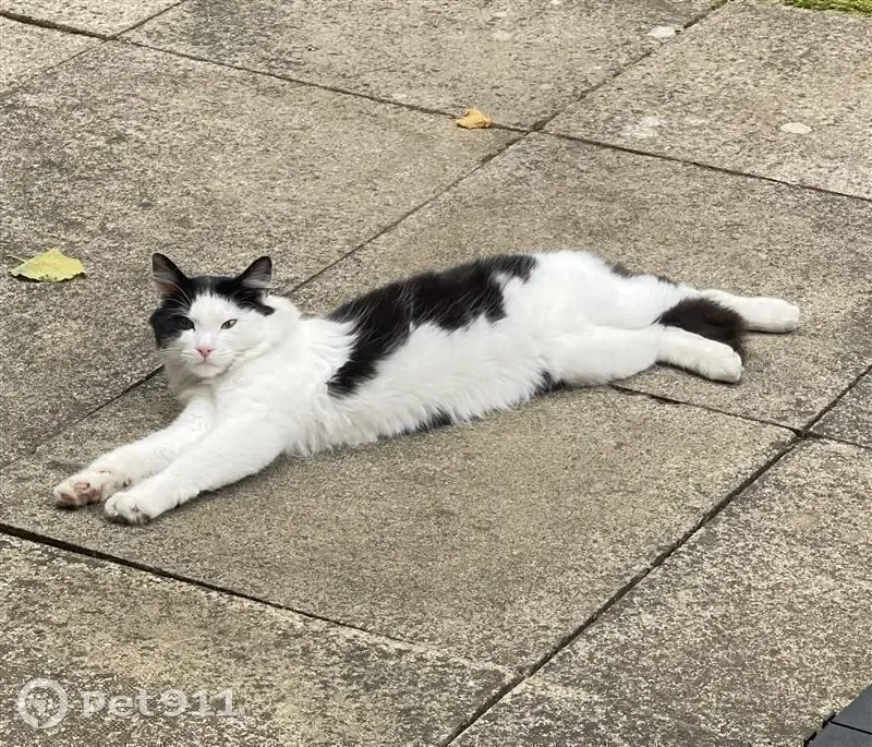 Kimi was last seen at 12pm Tuesday 31st March. He is an outdoor, black and white tuxedo cat. No collar, male, neutered. He has a big bushy tail, and a black dot on his back right paw. Last seen leaving our garden.